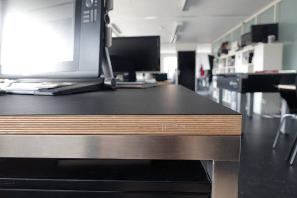 Multifunktional und in vielen Farben erhältlich. Tischblatt Multiplex-Birke, belegt mit Linoleum, aufgelegt auf ein Edelstahl-Tischgestell.